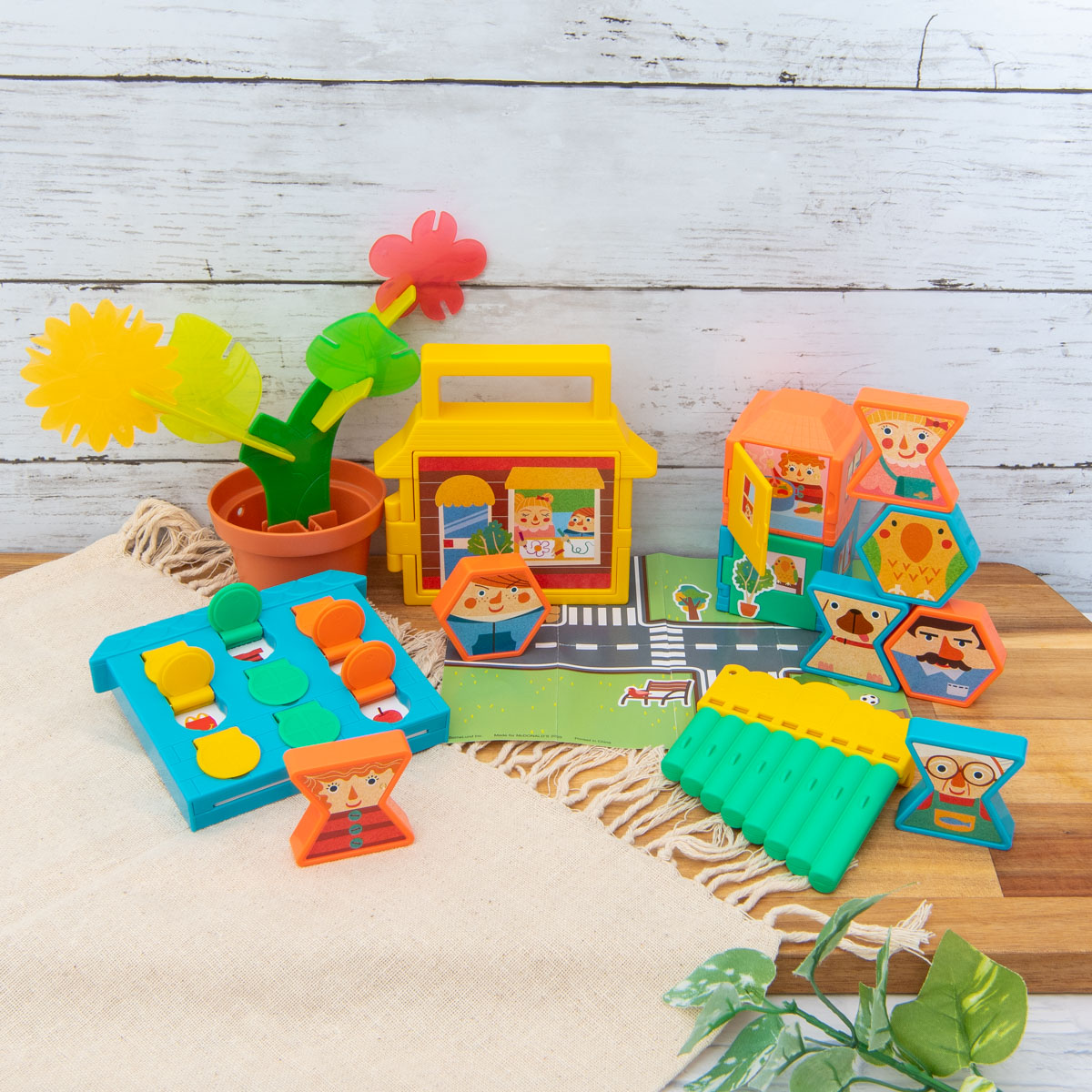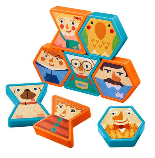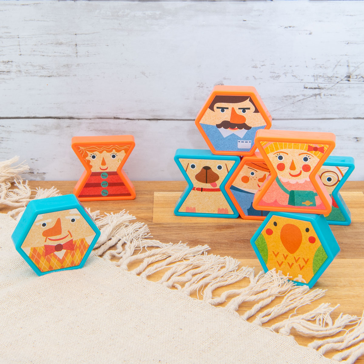 パズルのように組み合わせて遊ぶことでかたちの認識の発達を促すほか、顔がついているブロックは人形あそびも楽しむことができます☆