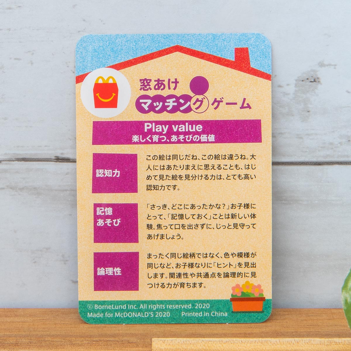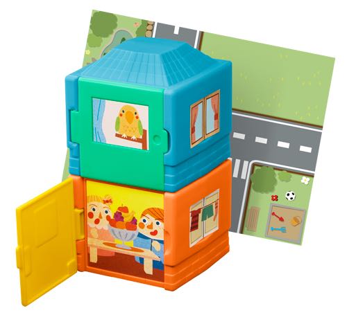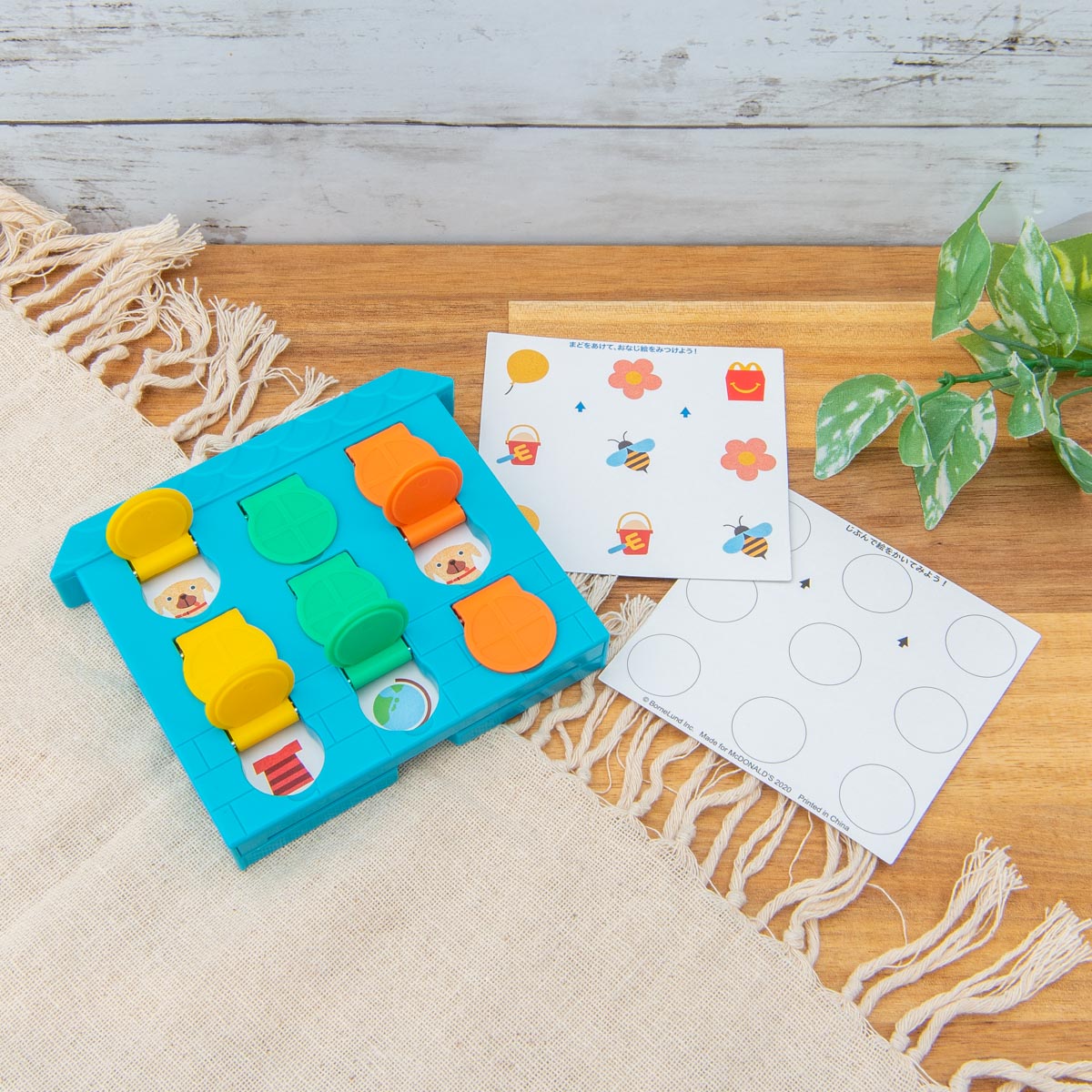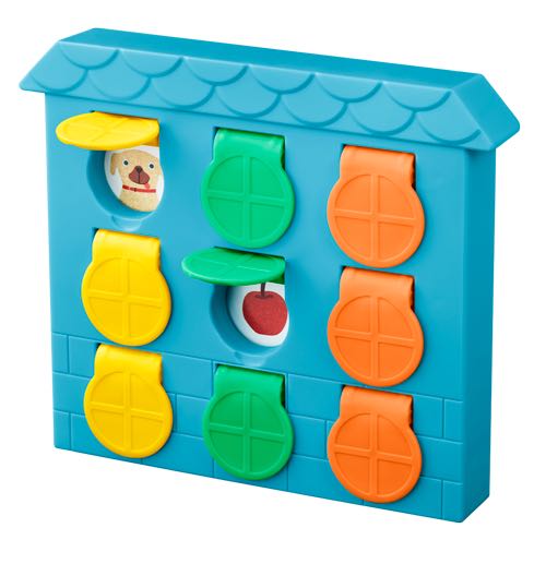カードを差し込んでから窓を2つ開け、同じ絵を探す絵合わせゲームができるおもちゃです。