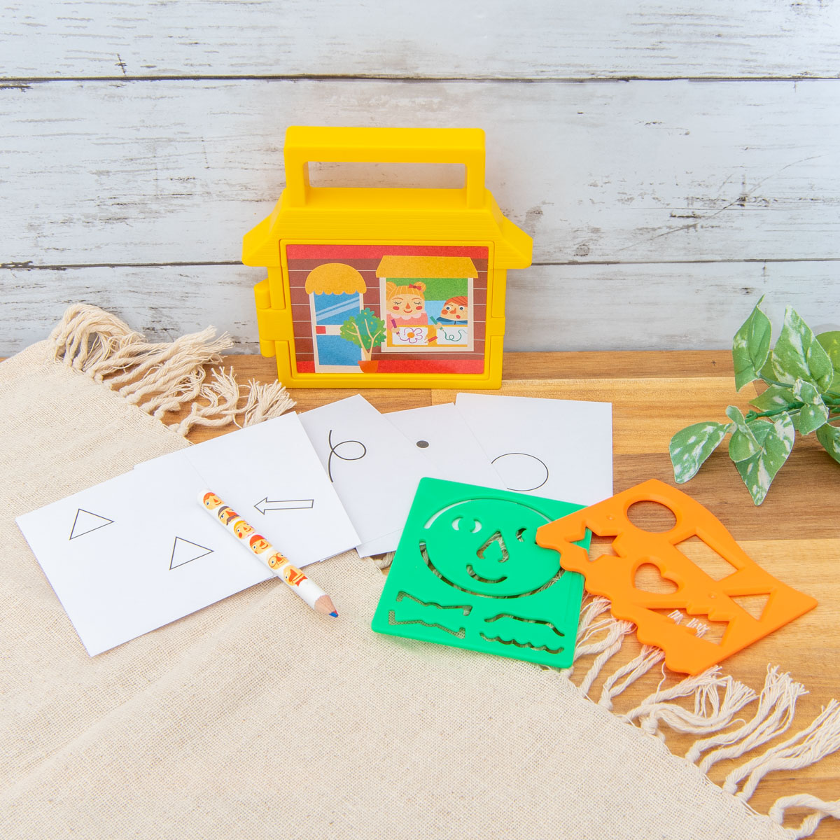 中に鉛筆と2種類のステンシル、記号が描かれた紙が入っていて、自由に絵を描くことができます。