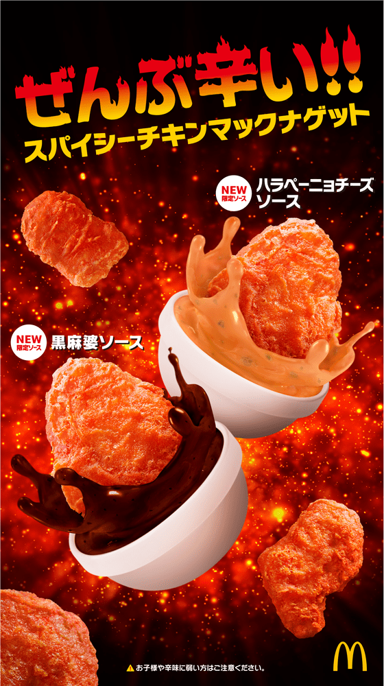 「スパイシーチキンマックナゲット」の⾟さをさらに引き⽴たせる2種類の「辛いソース」で、史上初の全部辛いラインナップとなっています☆