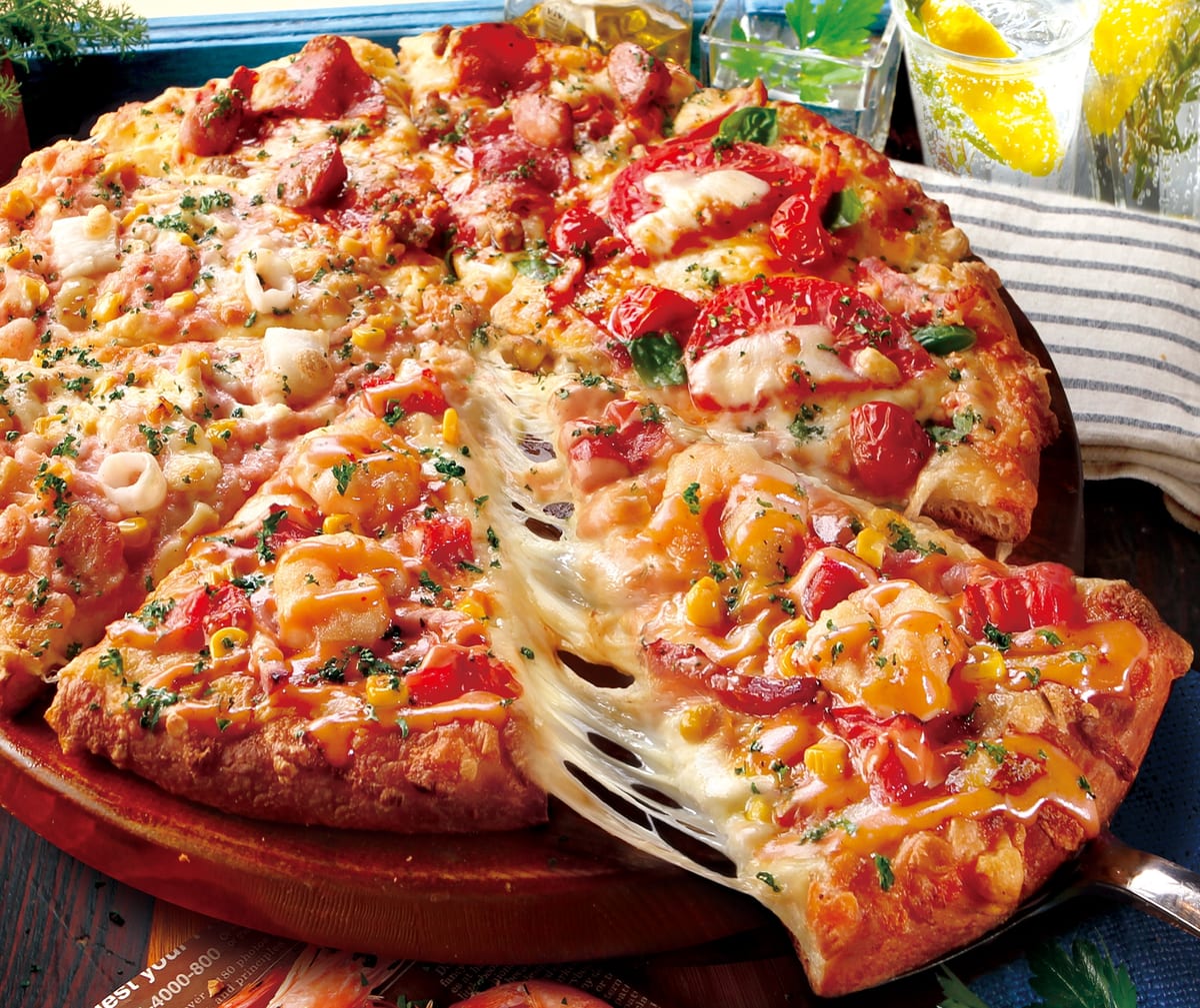 プリプリ食感の海老をふっくらとした衣で包んだエビフリッターに、特製オーロラソースが相性抜群の『ピザーラ エビマヨ』、本場博多の明太子を使用した『もち明太子ピザ』、2種のトマトとバジルでフレッシュな味わいが際立つ『フレッシュトマト&バジル』、熟成ペッパーソーセージやイタリアンサラミなど4種のミートを使用した『熟成ミートラバー』などの4種類の味を1枚で楽しめます☆
