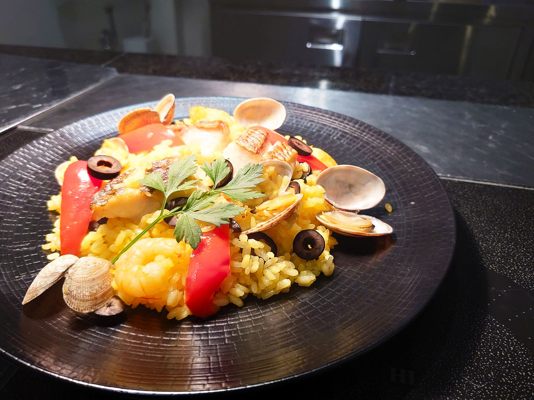 魚介のスープとサフランを使って炊き上げるパエリアは、風味豊かな一品です。