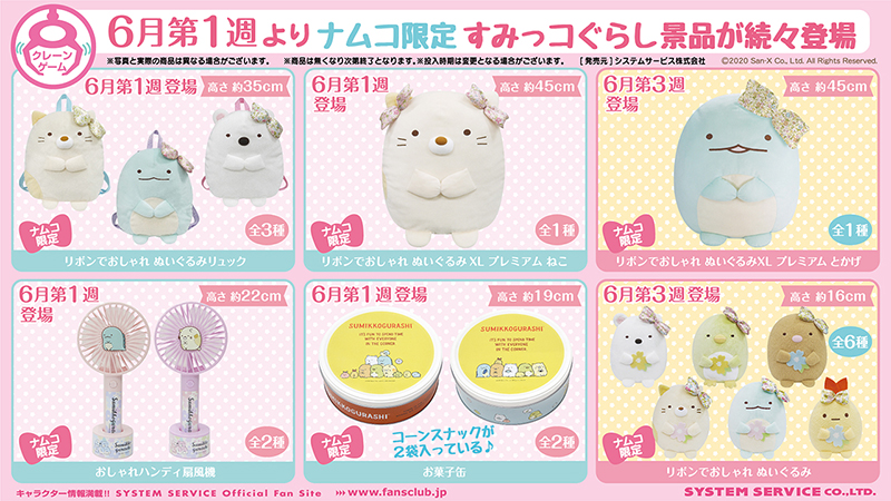 ナムコ限定の『すみっコぐらし』景品が、2020年6月第1週よりクレーンゲームに続々登場!