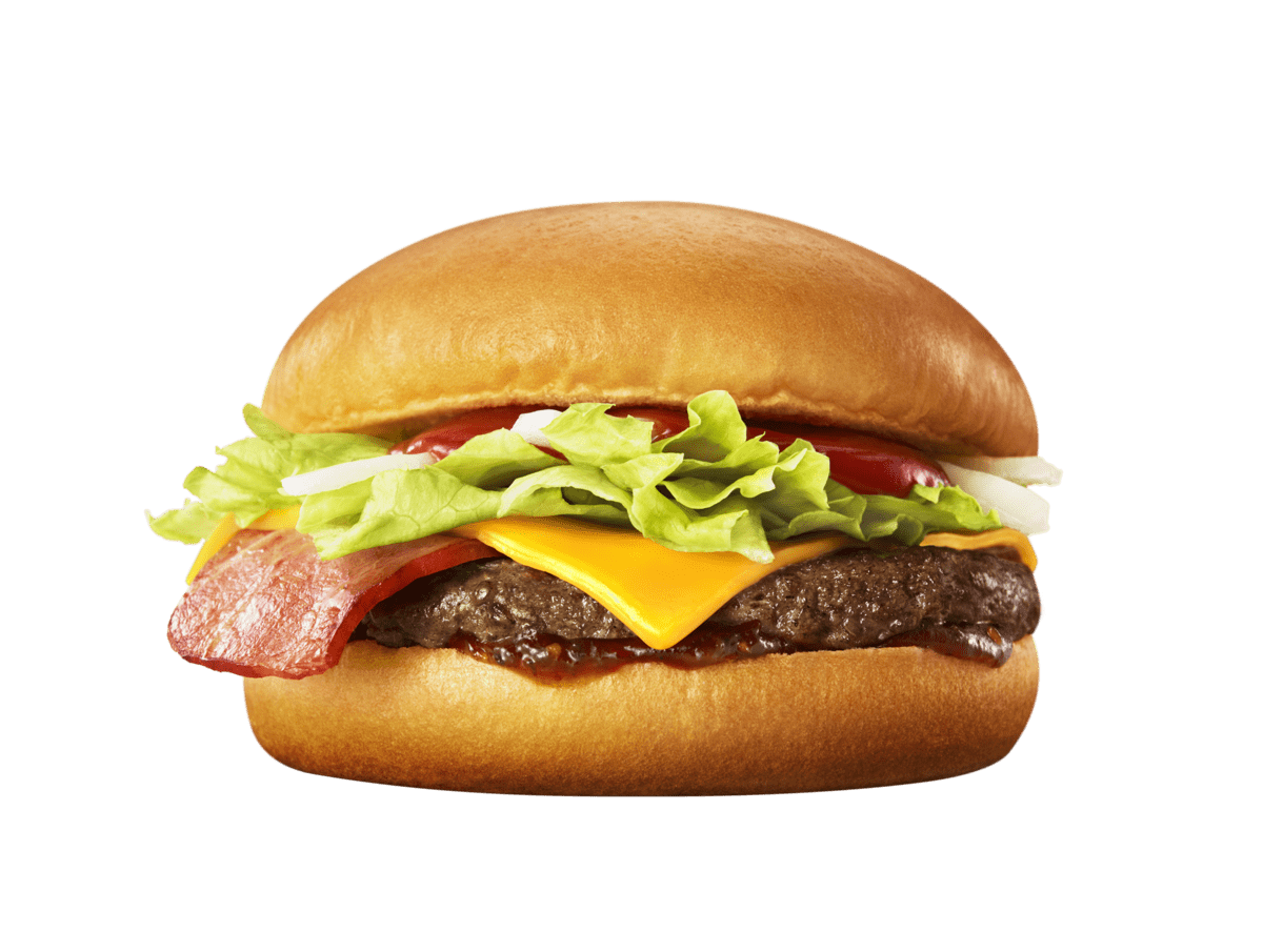 ジューシーさが自慢の厚みのある「100%ビーフパティ」やスモーキーなベーコン、シャキシャキのレタスとオニオン、マイルドでコクのあるチェダーチーズを使用。