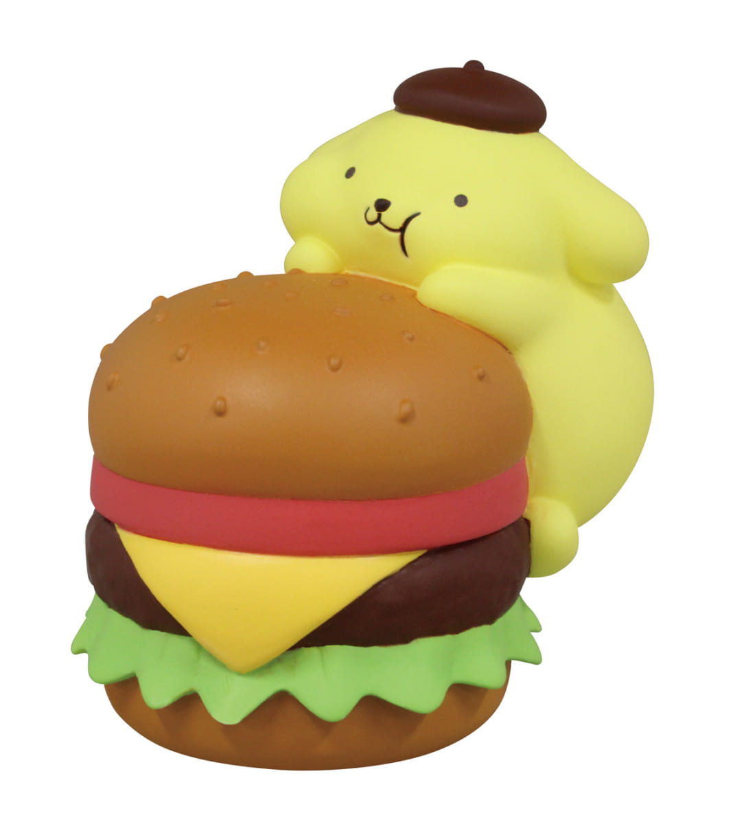 大きなハンバーガーの上に載ってほっぺをふくらませる「ポムポムプリン」