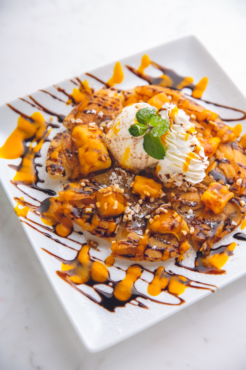 サクサクのパラタ(インド発祥のパン)に、フローズンマンゴー、ココナッツアイス、生クリーム、マンゴーソース、チョコレートソースをトッピング。