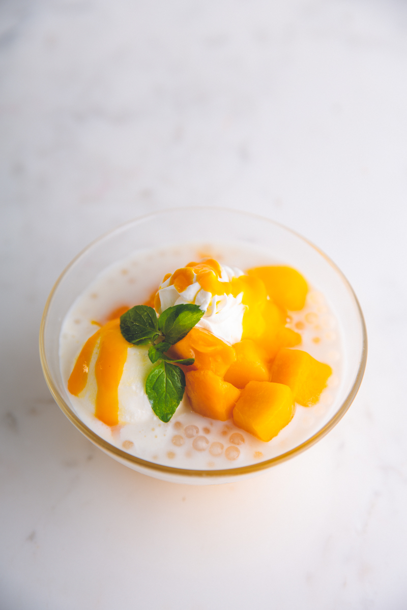冷たいココナッツミルクに、フローズンマンゴー、アイスクリームタピオカ、マンゴープリンが浮かべてあります。