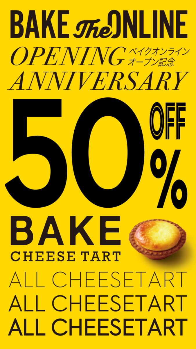 「BAKE THE ONLINE」オープンキャンペーン第一弾として、オンラインショップでしか入できない「BAKE CHEESE TART チーズタルト 10P BOX(各種)」が50%オフ!