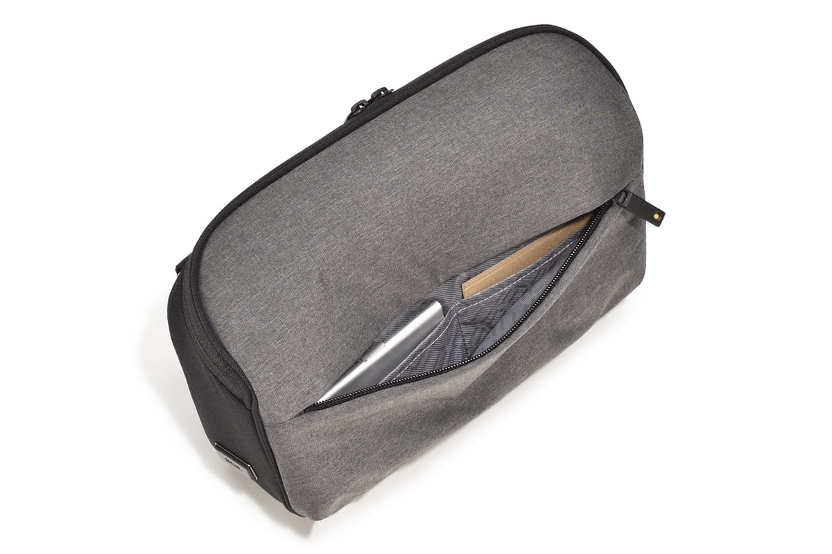 「ラウンドファスナー」採用で、体に近い部分から大きく開いて、中身を出し入れしやすくなっています。