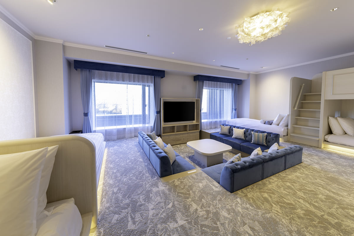 対象の客室は全6種類あり、最大6名で利用できる「スペーシャスルーム」では仲間とのパーティや家族全員での団らんなどを楽しめます。
