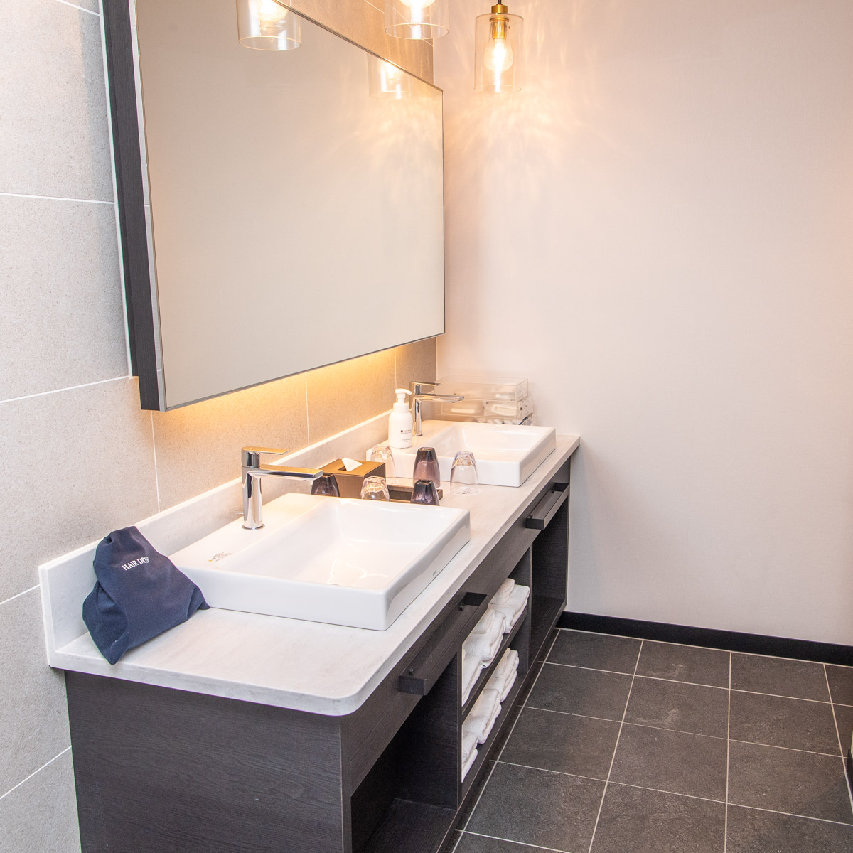 大きな鏡で、仲間とおしゃべりを楽しみながらお化粧やスキンケアができるダブルベージン仕様になっています。