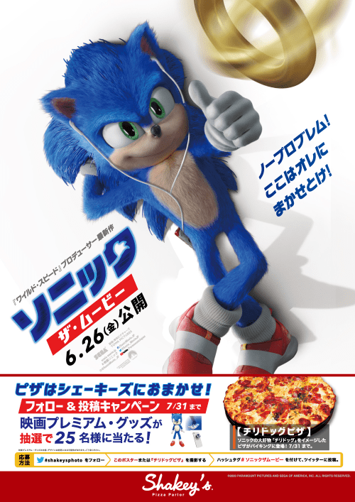 応募方法:シェーキーズ公式ツイッターアカウントをフォローし、「チリドックピザ」または店頭ポスターを撮影した写真と「#ソニックザムービー」のタグをつけて投稿