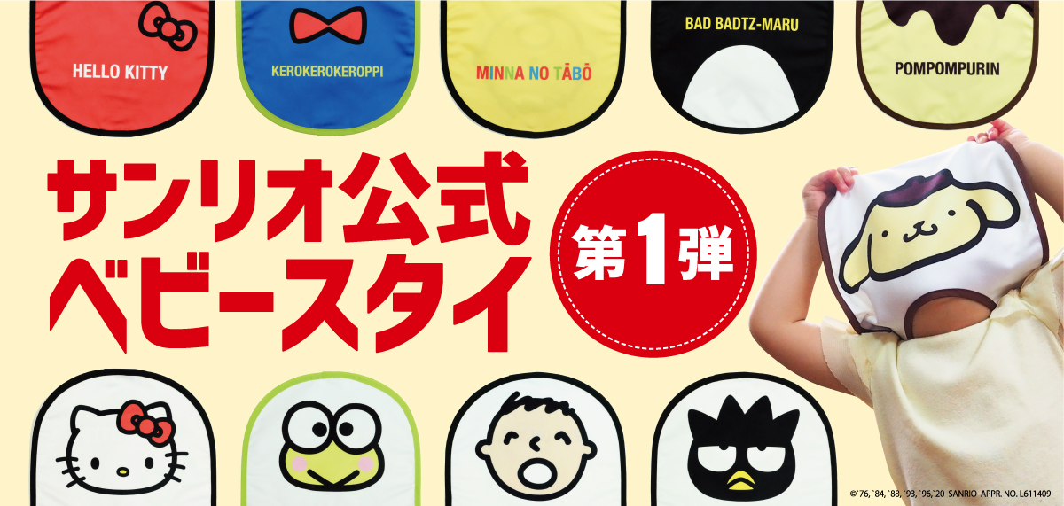 今回は、全世代に永く愛されるキャラクター「ハローキティ」「けろけろけろっぴ」「バッドばつ丸」「ポムポムプリン」「みんなのたあ坊」が、かわいすぎる体モノマネベビースタイに大変身。