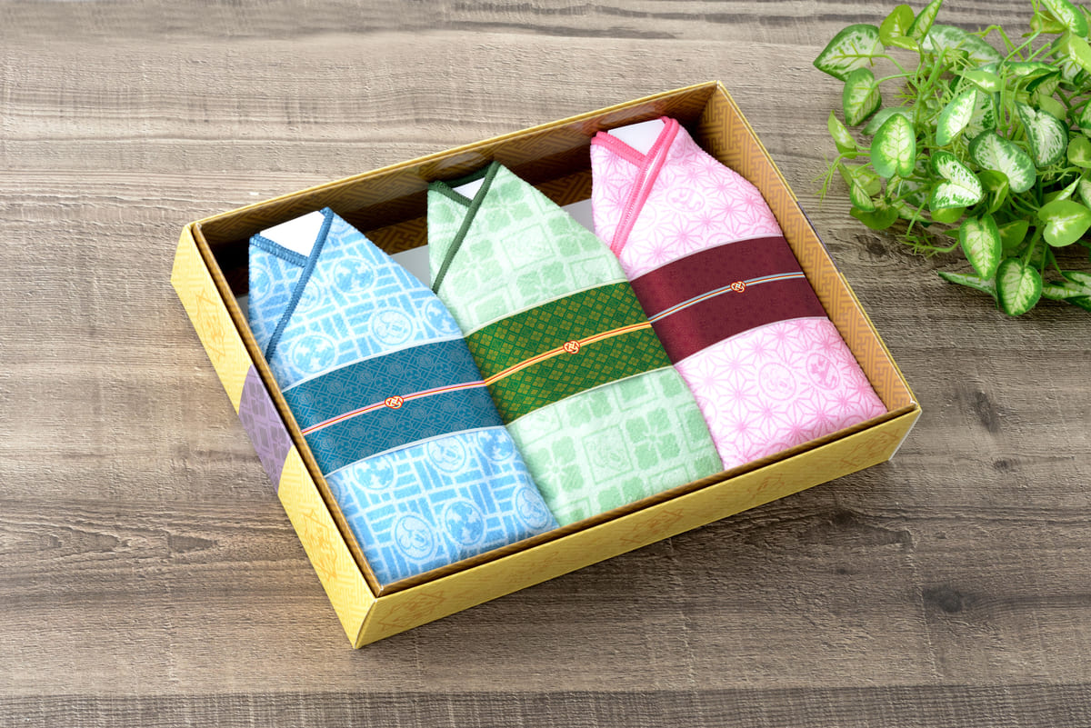 着物風に梱包された、和柄デザインのタオルギフトセット。