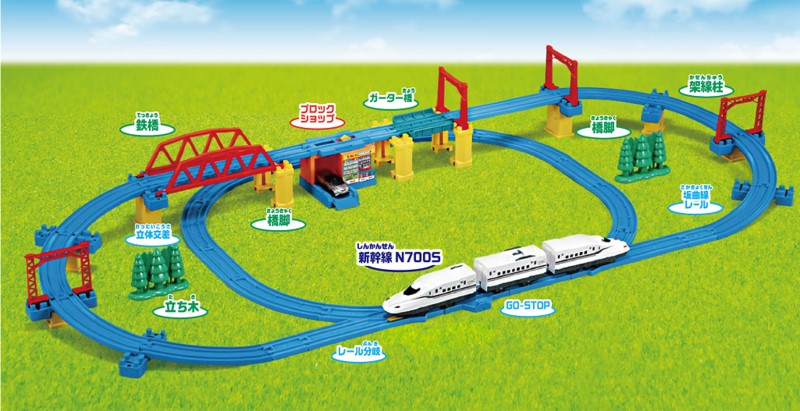 商品内容:直線レール(2)、1/2直線レール(5)、ガーター橋(1)、1/4直線レール(凸凸)(1)、1/4直線レール(凹凹)(1)、1/4直線レール(凸凹)(2)、曲線レール(6)、1/2ストップレール(1)、ターンアウトレール(L)(1)、ターンアウトレール(R)(1)、坂曲線レール(A)(4)、坂曲線レール(B)(4)、坂曲線レール用橋脚L(2)、坂曲線レール用橋脚M(2)、坂曲線レール用橋脚S(2)、ブロック橋脚(3)、鉄橋枠(2)、単線架線柱(4)、立ち木(半立体)(2)、ブロックショップ(1)、ブロックショップ用レール(1)、新幹線 N700S 3両編成(1)、シール(1)、レイアウトブック(1)、部品注文書(1)