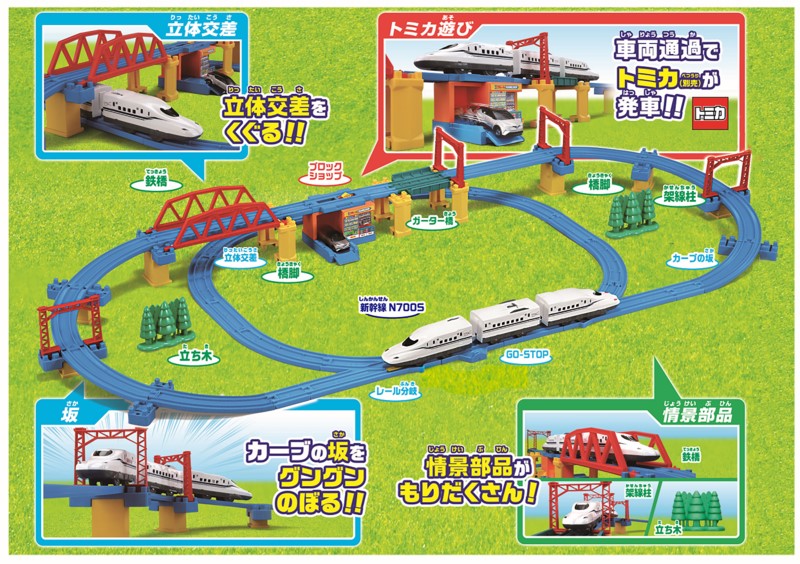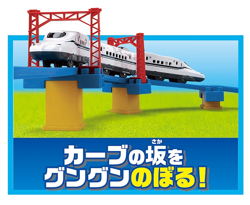 新幹線「N700S」を徹底的に再現した車両と、架線柱+曲線レールで「疾走感」、高架+鉄橋+橋脚で「立体感」、ブロックショップで「駅前シーンの再現」など、同車両を「かっこよく」走らせられる”情景パーツ”がすべて集結したセットです。