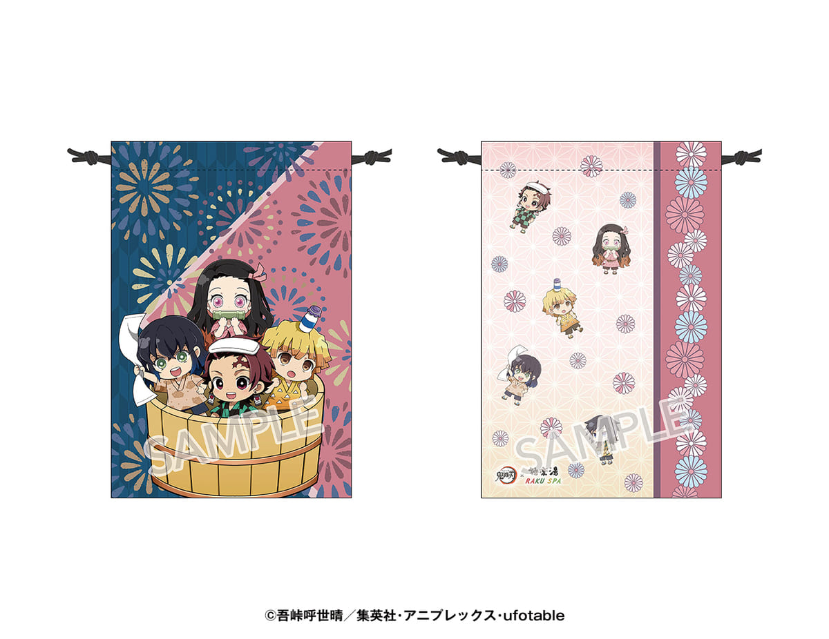今回実施される「休息セヨ!炭治郎たちの極楽な休日」では、第1弾と第2弾でもらえる手ぬぐいが変わる鬼滅プラスセットのほか、描き下ろしイラストのグッズも販売。