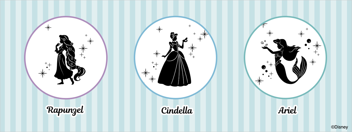 ディズニープリンセスは、『塔の上のラプンツェル』から「ラプンツェル」、『シンデレラ』から「シンデレラ」、『リトル・マーメイド』から「アリエル」の3人。