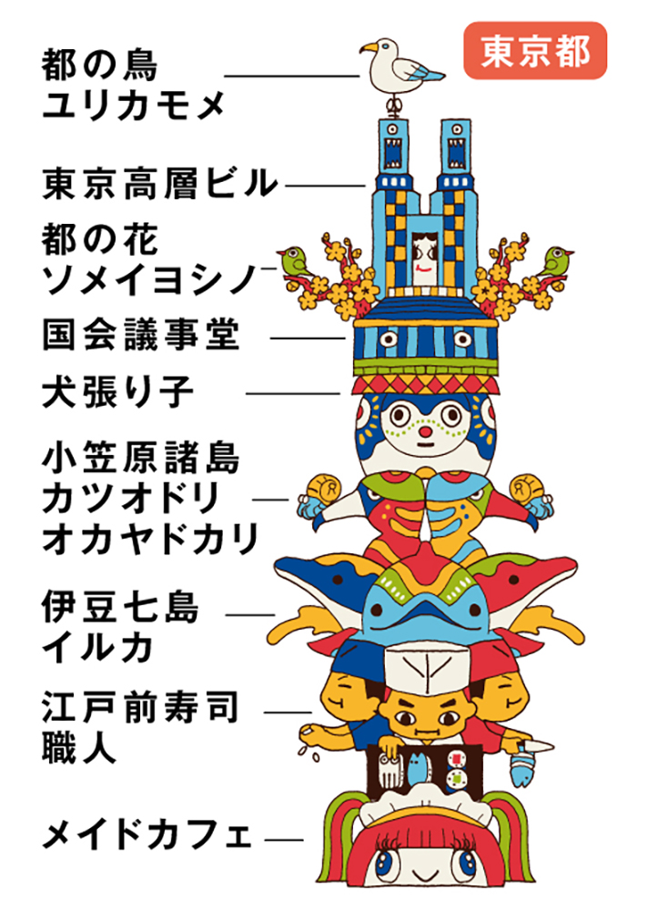 ご当地トーテムポールは、正式に決定されているご当地の花や鳥などの他、ご当地に棲息する動物、ご当地グルメ、象徴する建造物や、その土地ならではの文化などで構成。