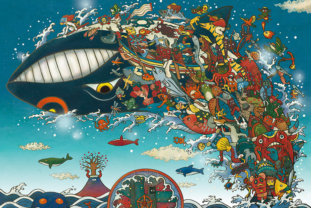 高知の生き物達がクジラを祝う、大きな、大きなクジラの跳躍を描いたアート作品をジグソーパズル化。