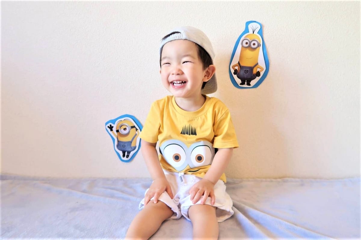 1.H&Mキッズの「ミニオン」コレクションのアイテムを身に着けたお子様の写真を撮影。