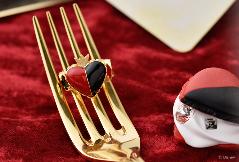 ゴールドの冠、ハートにあしらわれた繊細な薔薇の装飾、女王のもとで働くトランプ兵をイメージしたダイヤ、スペード、ハート、クラブで繋がれたリングはどこを切り取っても「ハートの女王」そのもの。