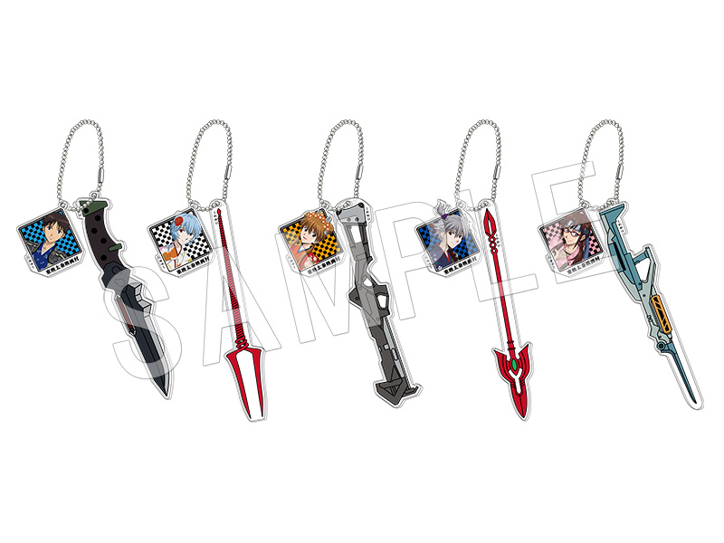 和装のキャラクターと、それぞれが搭乗するエヴァンゲリオンの武器がセットになったダブルチャームデザインになっています。
