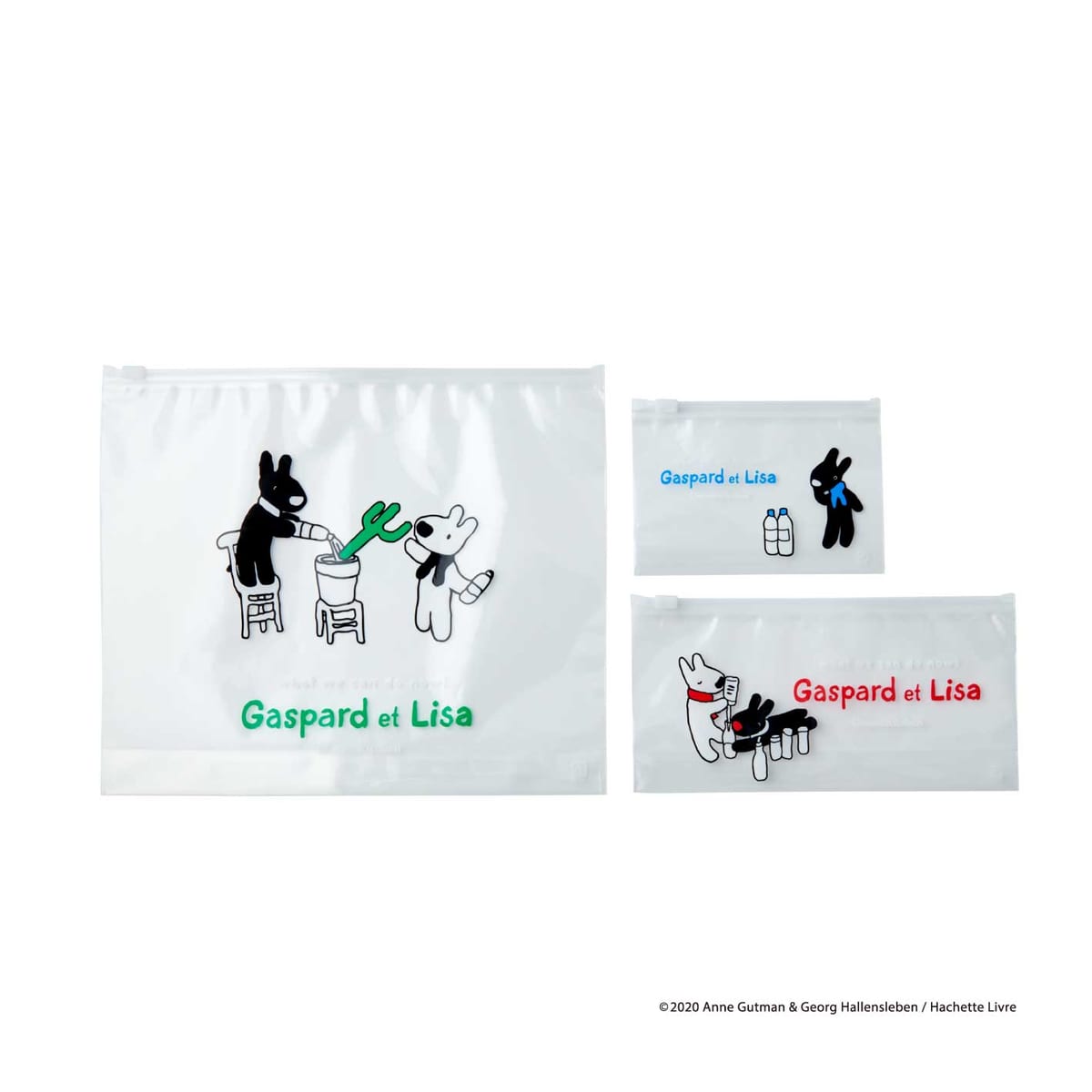 リサとガスパールが「ちきゅうを すくう」ためにアクションを起こしている様子がデザインされた、おしゃれでかわいいポーチ3枚組みです。