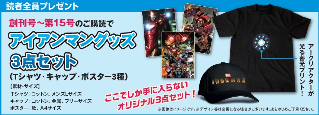 週刊『アイアンマン』の創刊号から第15号まで購読された方に「読者全員プレゼント」を用意。