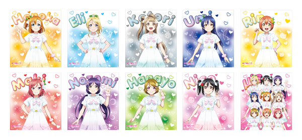 第2弾は、「μ’s」のメンバーたちがデザインされた「限定クリアブロマイド」が用意されています。