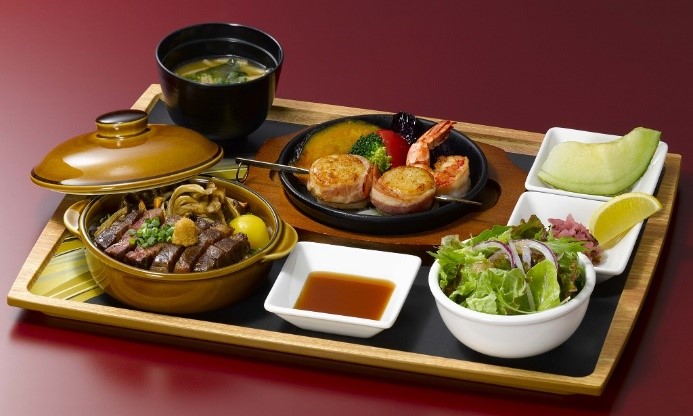 内容:神戸ビーフステーキご飯、だし醤油と北海道産山わさびの醤油漬け、舞茸・ぶなしめじ・栗の甘露煮の付け合わせ、宗谷産大粒帆立と海老のグリル~鉄板焼き~、おろしゆずぽん酢ソース(高知県産ゆず使用)、国産野菜サラダ~オニオンドレッシング~、味噌汁、漬物(国産野菜の京華だいこん)、国産メロン