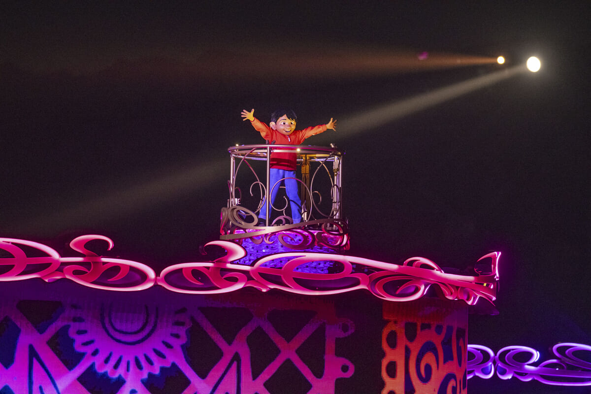 特に、ショー初登場となるディズニー&ピクサー映画『リメンバー・ミー』の主人公ミゲルが自分の夢を歌い上げる シーンでは、東京ディズニーシー・ ホテルミラコスタ®の壁面にカラフルで華やかなマッピングが施され、映画の「死者の国」での盛大な祝祭に入りこんだような体験ができます☆