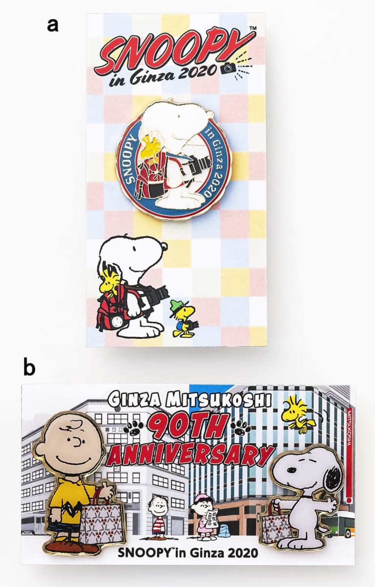 価格:a 715円(税込)(直径約3cm)、b 【銀座三越90周年記念デザイン】(スヌーピー 約W2.3×H2.7cm、チャーリー・ブラウン 約W2.6×H3.7cm)1,100円(税込)