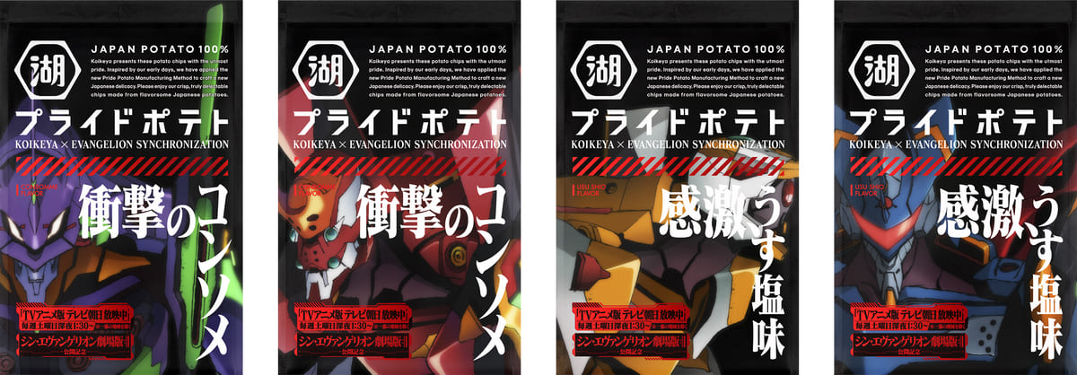 湖池屋の「プライドポテト」の中でも定番人気フレーバー「衝撃のコンソメ」と「感激うす塩味」が「エヴァンゲリオン」コラボパッケージで発売中!