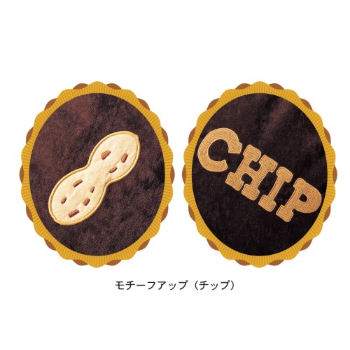 背もたれや背面には、「チップ」のロゴと、大好物のピーナッツやリンゴのモチーフ刺繍入り。