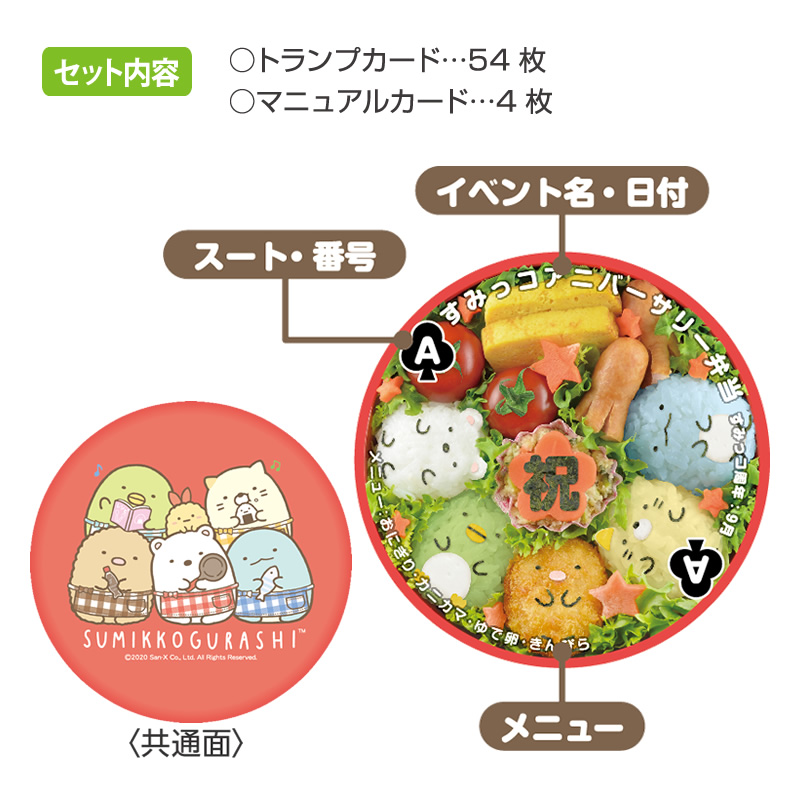 カードには、「すみっコぐらし」のお弁当の写真のほかに、トランプのマークと数字、イベント名と日付、おべんとうのメニューが書かれています。