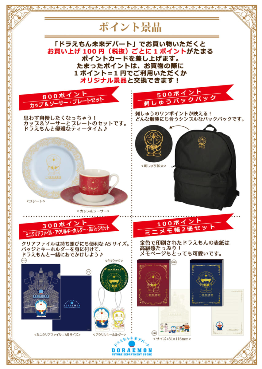 お買い物をした金額に応じて付与されるポイントを貯めて、「ドラえもん未来デパート」限定の素敵な景品(非売品)と交換できるお得なカードです。