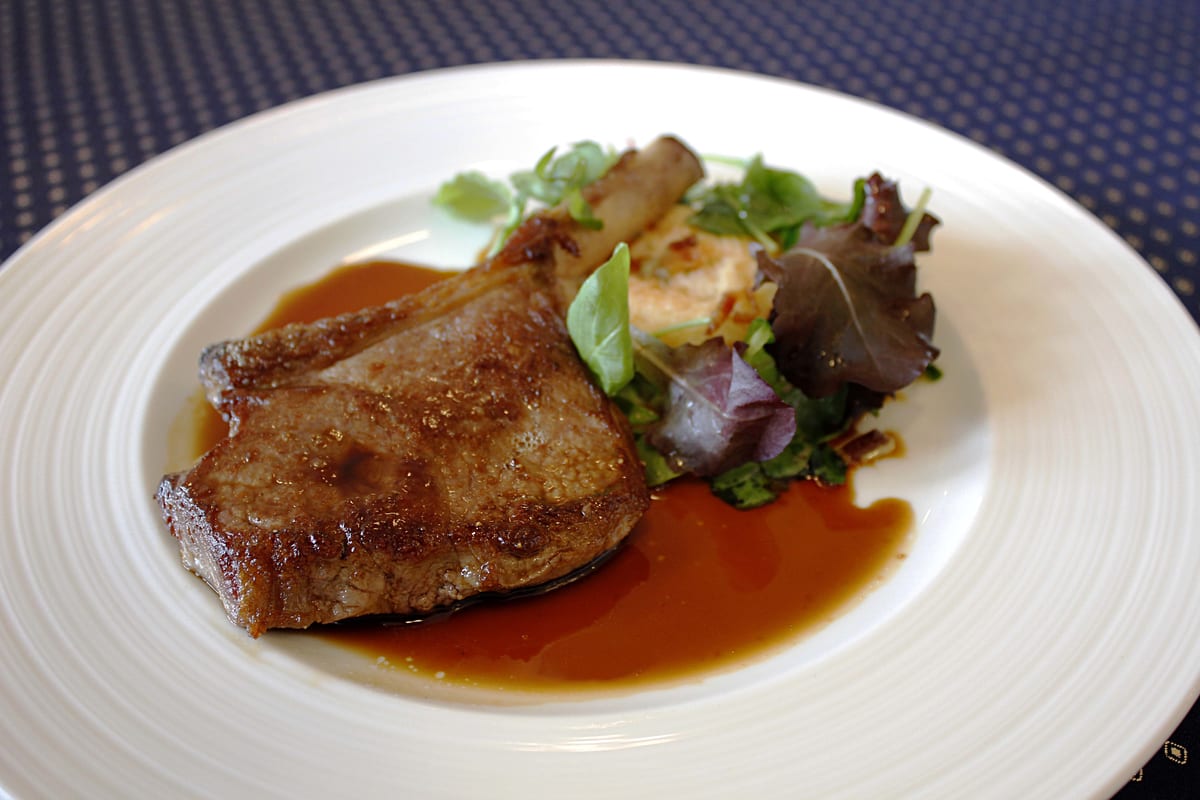 ポテトの衣をまとったスズキのロースト 特製トマトソースと、骨付き仔牛肉のソテー 旬の野菜と揚げ玉子添え マルサラ酒のソースで(写真)が提供されます。