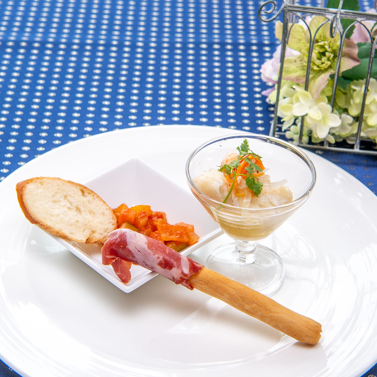生ハムとグリッシーニ、旬の野菜のカポナータ、魚貝類のエスカベッシュの盛合せです。