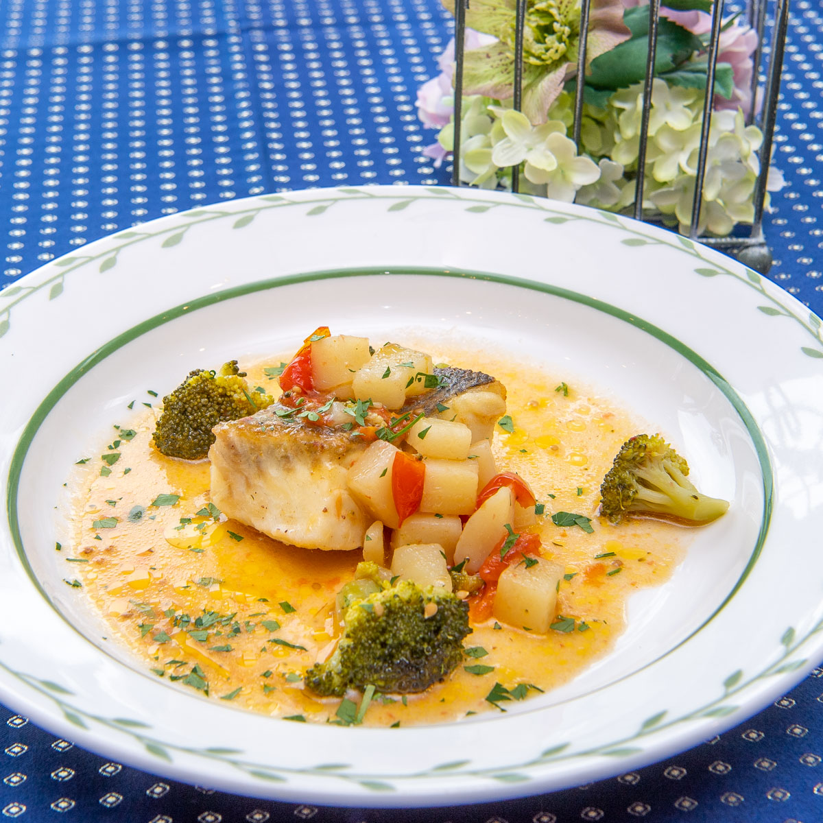 スズキのアクアパッツァ 旬の野菜添えは、梅雨の時期から夏が旬といわれるスズキを使った一皿。