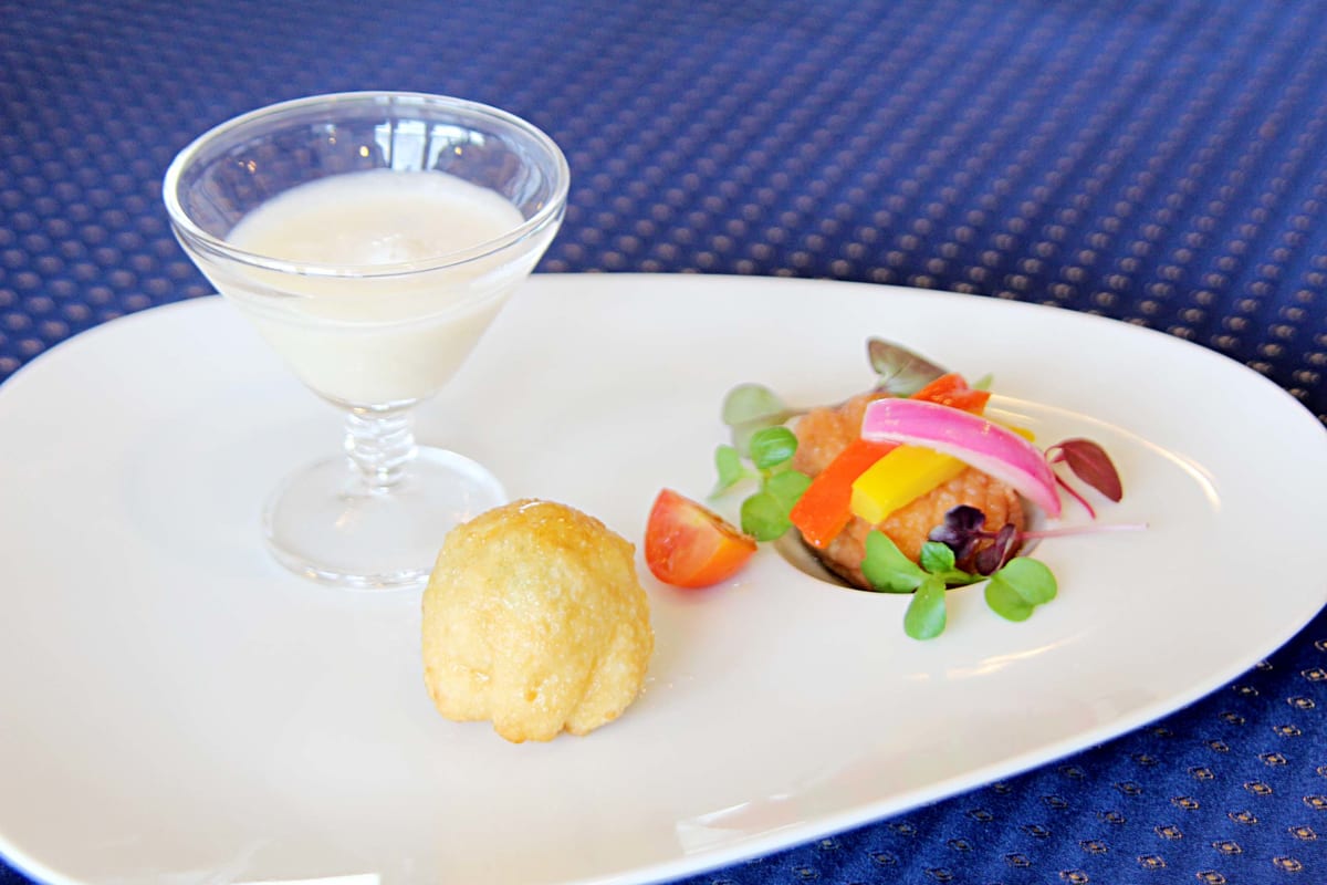 フレッシュサーモンのアグロドルチェ、ゴルゴンゾーラとアボカドの揚げピッツァ、白桃の冷たいスープが提供されます。