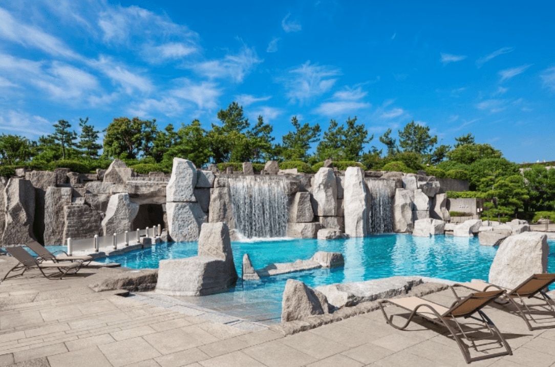 迫力満点の滝が流れる、リゾート感満載のプール!