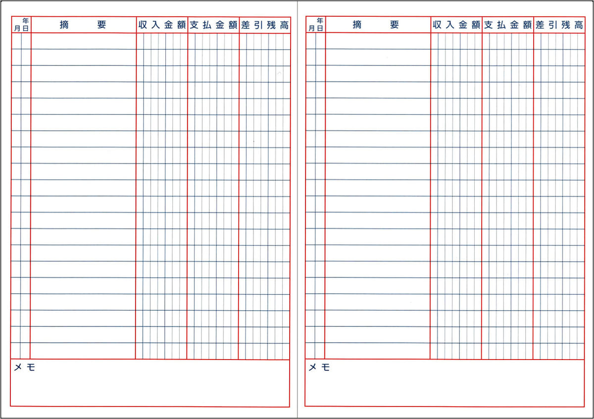 本文は、黒の筆記具で書くと書いた文字が読みやすい赤と青の刷り色になった金銭出納帳です。