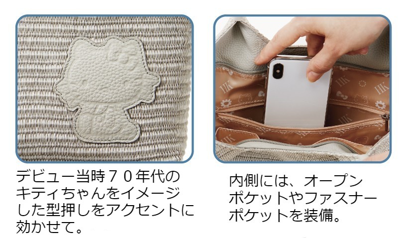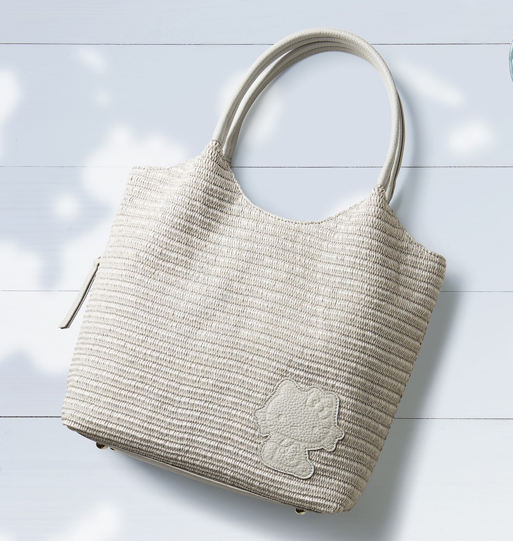 「ハローキティのラフィア調タウントート」は、ハイブランドのアイテムにも採用され、ヤシの葉を乾燥させて編み上げたかごバッグや帽子などで人気の「ラフィア」をイメージして作られています。