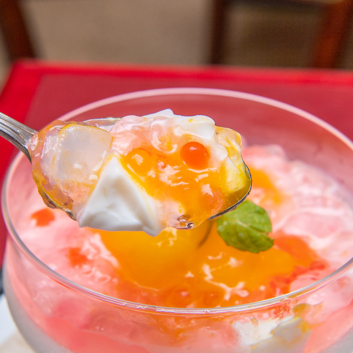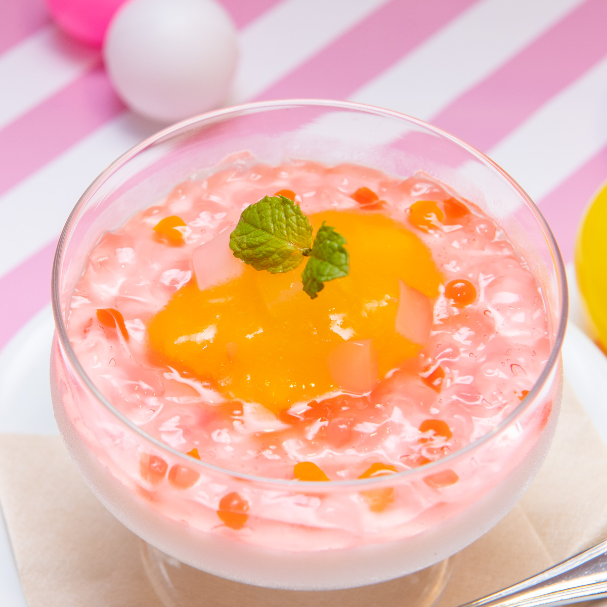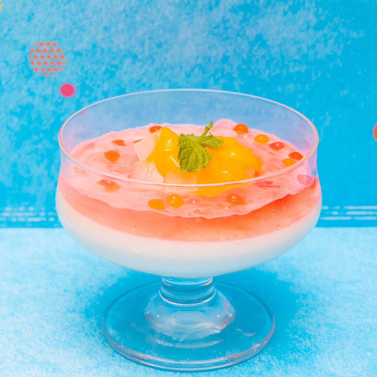 杏仁豆腐、ピーチジュレ、マンゴーソース、ナタデココ、ビーズと多彩な素材を一度に楽しめる贅沢なスイーツです。