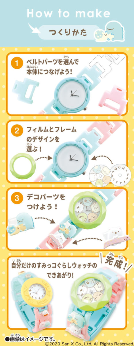 「すみっコぐらし」のキャラクターパーツを組み合わせて自分だけのオリジナル腕時計が作れるセットで、2020年7月下旬より発売されます☆
