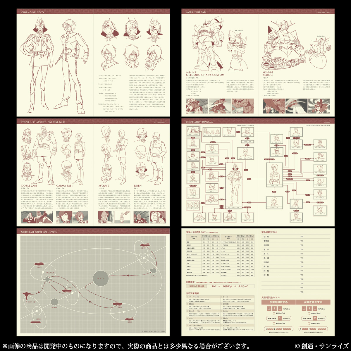手帳内には、搭乗機など「シャア」のパーソナルデータや搭乗モビルスーツの情報「認めたくはないものだな。自分自身の、若さゆえの過ちというものを」「坊やだからさ」など「シャア・アズナブル」のセリフを集めた名言集、人物相関図や一年戦争年表など、シャアの関連情報ページが満載です。