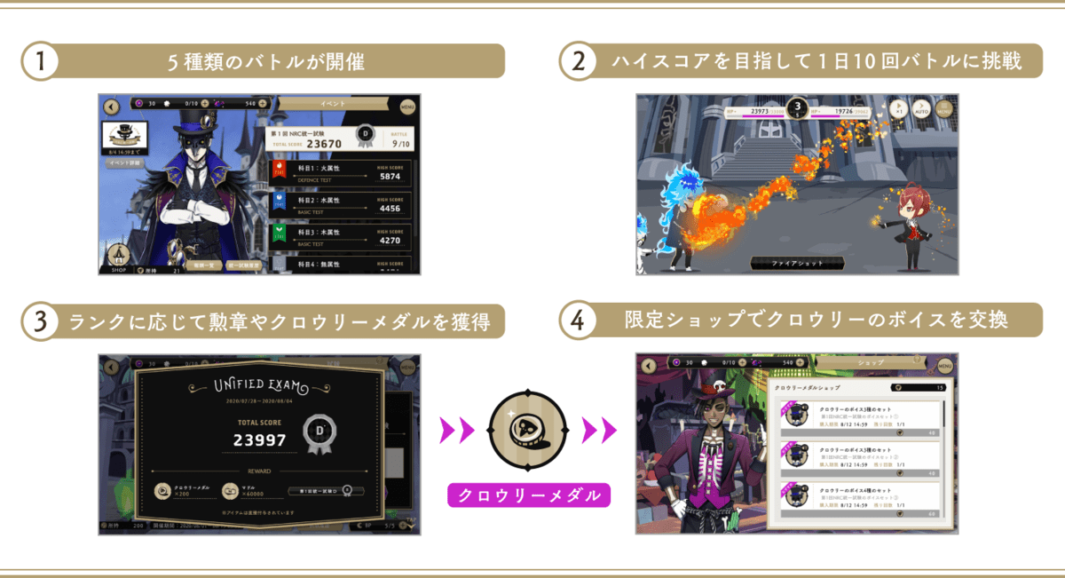 イベントを通して、ショップで限定ボイスや各種アイテムと交換できる「クロウリーメダル」を獲得することができます!