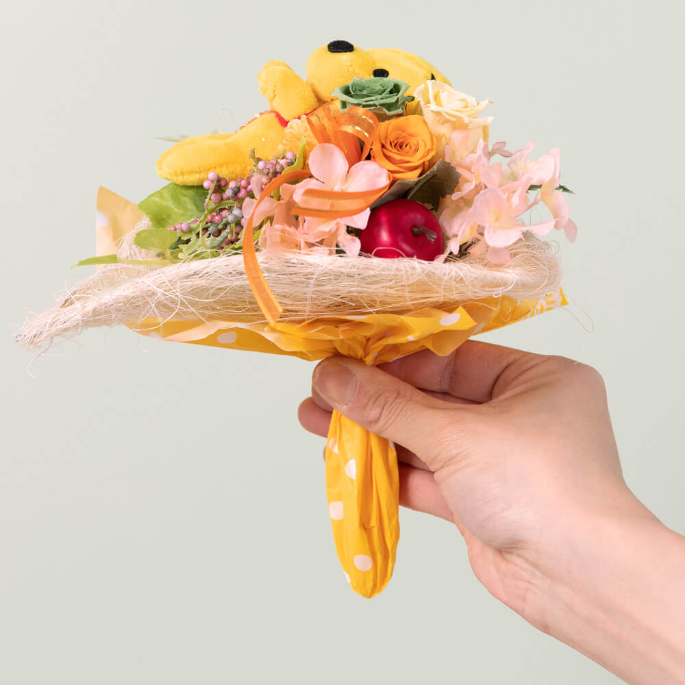 クリアケースのまま飾っても、ご自宅の花瓶に入れて飾っても可愛らしい、ぬいぐるみ付きのブーケです。