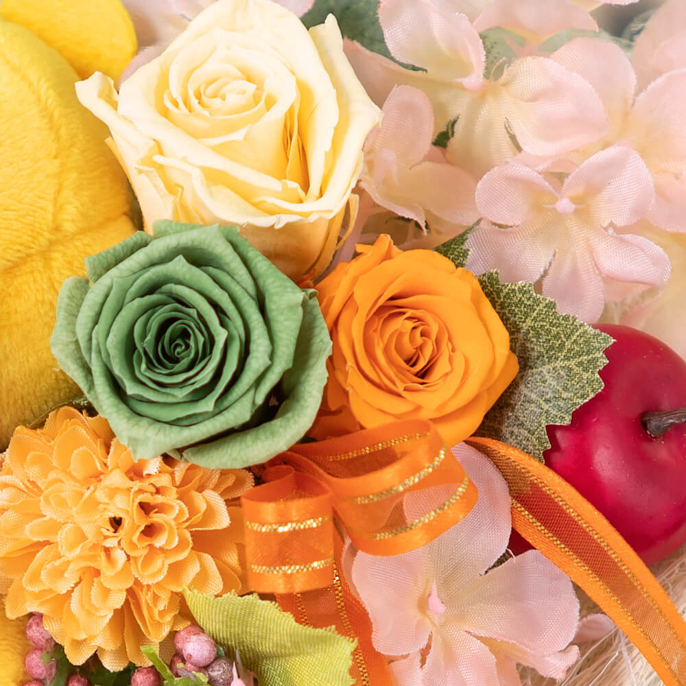 バラのプリザーブドフラワーと色とりどりの花々や実もので可愛らしくアレンジ。